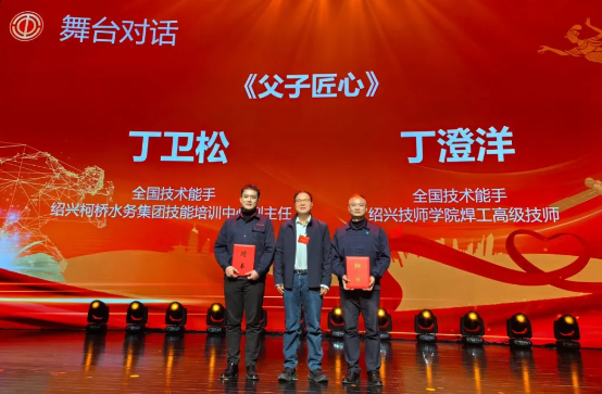 其中,全國技術能手、浙江省勞動模范、柯橋水務集團技能培訓中心常務副主任丁衛松,以及同為全國技術能手的兒子丁澄洋同臺,通過一出舞臺對話——《父子匠心》,講述父子兩代“接力”續寫勞模工匠的勵志故事,生動的故事和真摯的情感引發了現場觀眾的深深共鳴。