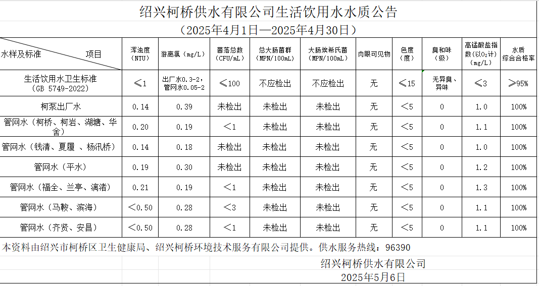 生活飲用水水質(zhì)公告(2025年4月1日—2025年4月30日)