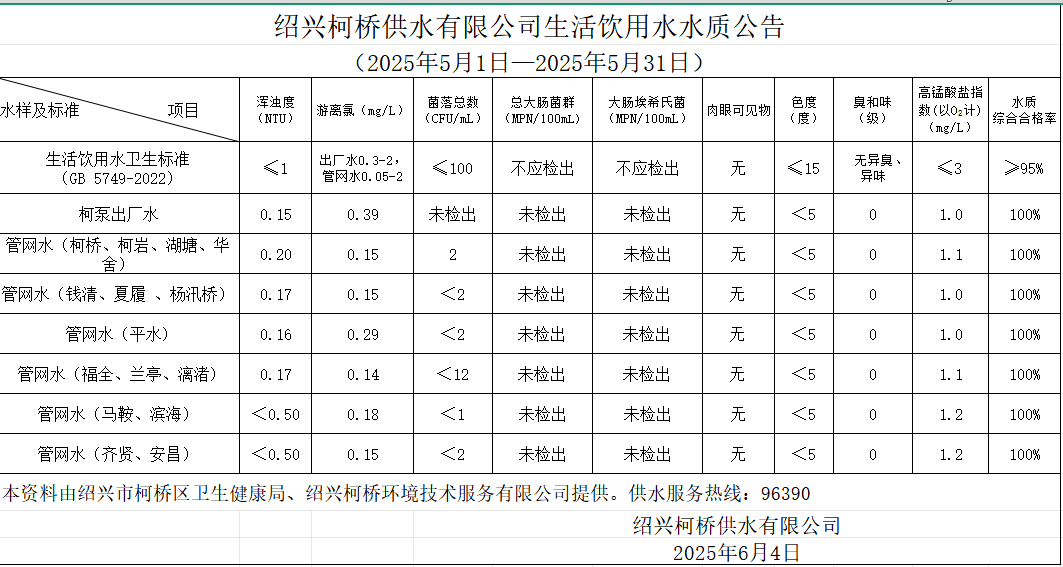 生活飲用水水質公告(2025年5月1日—2025年5月31日)