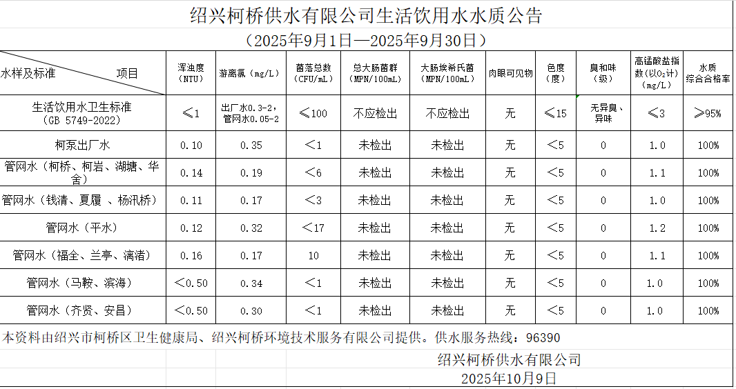 生活飲用水水質公告(2025年9月1日—2025年9月30日)