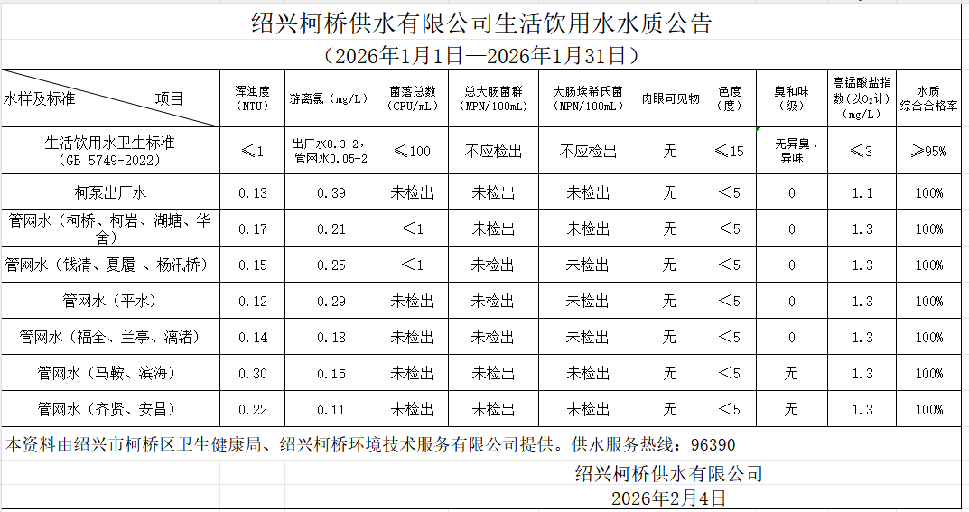 生活飲用水水質(zhì)公告(2026年1月1日—2026年1月31日)
