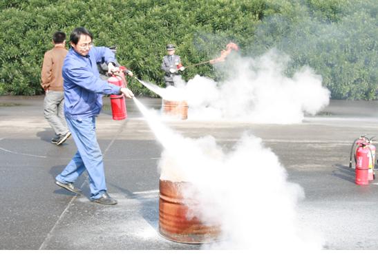 春季消防演習(xí)是水處理公司一項(xiàng)常規(guī)性的安全工作。其出發(fā)點(diǎn)是增強(qiáng)員工的防火意識(shí),提高員工使用干粉滅火器的熟練度。演習(xí)以干粉滅火器近距離油類滅火為主,分為培訓(xùn)和實(shí)踐兩個(gè)部分。經(jīng)過(guò)簡(jiǎn)單培訓(xùn),參與演習(xí)的人員均能根據(jù)風(fēng)向合理判斷噴射干粉的科學(xué)位置,并成功實(shí)施滅火。