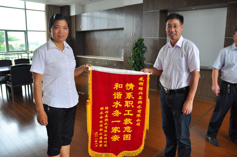 日上午,柯西分公司職工莫煜君在分公司經理田長榮及其所在村村支書的陪同下來到公司送上一面“情系職工救危困,和諧水務一家親”的錦旗,感謝公司對她的關愛和幫助。